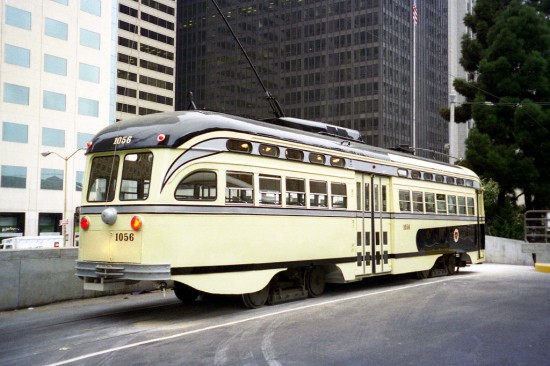 Now numbered 1056 in the Muni fleet, this PCC started off life as no. 2113 in the Philadelphia Transportation Company fleet. As with the other PCCs we have seen over the past few weeks this car was acquired by Muni in 1992 and after restoration in 1993 it entered service on the “F” line when this opened. Whilst we see this car in September 1996, 1056 has gone on to be the least used of the PCCs acquired for the opening of the “F” line (except for 1054 which was involved in a collision with a LRV in 2001 and deemed uneconomic to repair) having itself been involved in an accident in the early 2000s and then withdrawn in 2010 after a fault was found. It has since enjoyed a second renovation during 2016 and returned to action in 2017. 1056 carries a “tribute” livery for Kansas City Public Service Company as we see in the following three images, which includes a reverse end shot.
