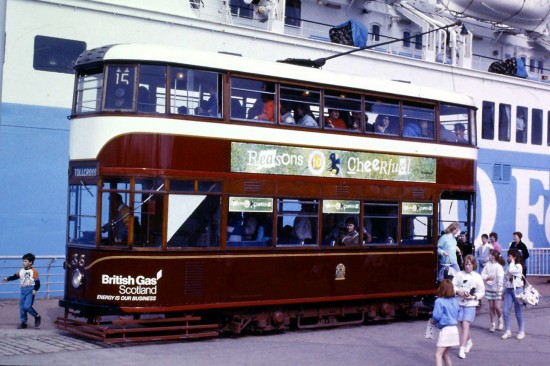 Edinburgh 35 was transported directly to Glasgow from a stint of operation in Blackpool – it had been in Blackpool since 1983 for operation during the Tramway Centenary which was its first passenger usage since the closure of Edinburgh’s original tramway in 1956. After running at the Garden Festival for five months the owners of the tram at time, City of Edinburgh Council, decided to send it on loan to Crich where it has remained as static exhibit ever since, requiring a major overhaul. Ownership of the tram has now been transferred to the Tramway Museum Society.