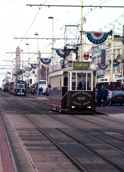This image shows 619 on 4th October 1997 with a service running to Pleasure Beach. It is leading a parade of trams including Ex-Towing Railcoach 680 (in Dillons bookshop advert), Centenary 645 (Mecca Bingo advert) and Ex-Towing Railcoach 679 (advert for Seagull Coaches).