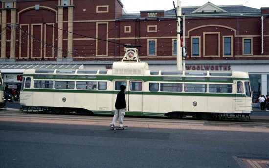 A skateboarder heads on by not seeming to notice (or maybe even care!) that they are just passing what was at the time of this photo the only operational Coronation Car in the Blackpool fleet! This is 660 close to the Tower in October 1997 with a small smattering of passengers on board as it heads south along the tramway. 660 – as 324 – was the 21st Coronation to enter service in August 1953 and would lose its VAMBAC equipment for conventional controllers in 1967. Retained as the sole Coronation Car when the rest of the class was withdrawn from service it would continue to fly the flag for this popular class up until the time 304 was restored to service. Both cars are out of service again and 660’s chance to shine again remain some way off with 304 the more likely example to return to action in the future.