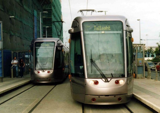 In this view we see two of the original Citadis 301 trams sitting at the Red line terminus of Tallaght in 2005. On the left is 3025 whilst nearest to the camera we see 3020. Both have yet to change their destination screens but 3020 presumably will be the first to depart as its driver waits in the cab. In this photo we can also see the small shelters and ticket machines installed for services to begin.