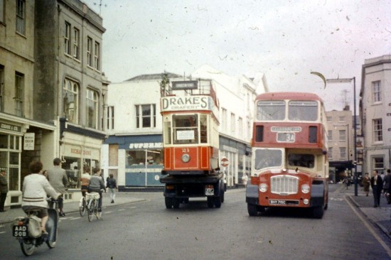 In this photo we see 21 on the back of a lorry (not really a low loader as we’re used to seeing trams transport on today!) as it moves through Cheltenham. Alongside is Bristol FLF bus which would be scrapped in 1982.