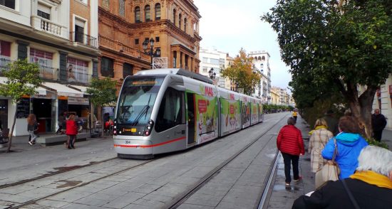 This image is again taken closer to the Cathedral with 304 on its way towards the single-line section. Again you can clearly see the lack of overhead wires with the tram operating under battery power with the batteries charged at each stop thanks to the charge bars provided there. Another all over advert features on 304 with this one for MAS discount store and various Christmas gifts. The photo was taken on Boxing Day 2017 after all so it can be excused for mentioning Christmas!