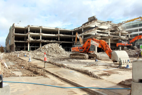A closer view of the demolition site showing the inner workings of the building and some of the rubble which has been removed from the structure.