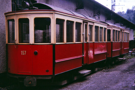 The system in Innsbruck has long used trailers to add capacity to services and a number of these were – as we saw with the motor last week – acquired from Basle in the early 1950s. In this photo we see a couple of the trailers – with a centre entrance – at Berg Isel Depot. Led by 157 the second trailer is unidentified. These Basel trailers would only have a couple more years left in service with withdrawal coming at the very end of 1966.