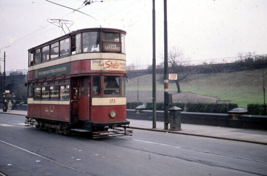 Horsfield Car 172 is seen here passing the Bus Station on York Street showing Corn Exchange on the destination indicator. Over 100 of these trams were introduced into service during the early 1930s named “Horsfield” cars about the then General Manager of Leeds Corporation Tramways, and sometimes referred to as “Showboats”. Although attempts to preserve a couple of additional trams in this class did not end up being successful (having to be scrapped at the Middleton Railway after severe vandalism), one does remain in the form of 180 at Crich.