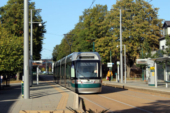 The Queens Walk stop looking towards Nottingham City Centre. The building on the centre right is the Pilgrim Centre.