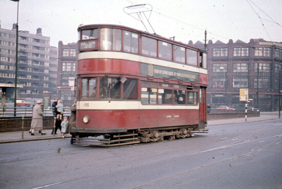 This time we see another Horsfield car with no. 195 running along York Street by the bus station with a route 20 service for Halton. The tram has stopped at the stop here – at least we hope it has! – as passengers start to board for a journey on the tram, judging by the lack of passengers on board the tram is at the start of its journey. There’s no end advert on 195 but we see a between deck ad for Co-Operative stores. We can also see a crossover just in front of the tram.