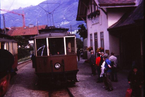 This image is again on the Stubaitalbahn and shows no. 4 at Mutters (thank you for large station names boards!) – this is one of the intermediate stations on the line. This car was built by Grazer Waggonfabrik in 1905 (the year after the line was opened) and differs in style from the original three motor cars. It is seen here in July 1964 still in its original brown and white livery which had mainly been replaced by Innsbruck red and white by 1964.