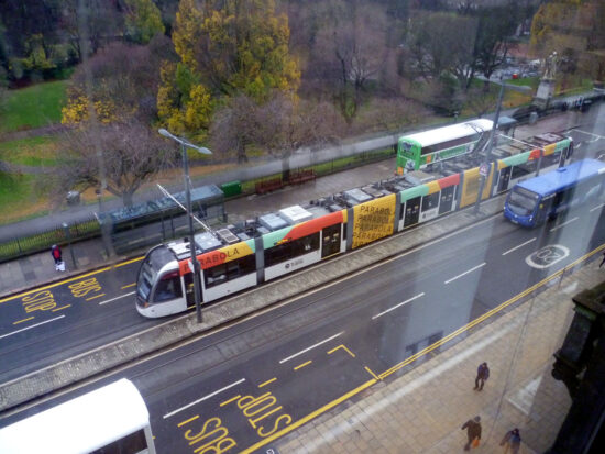 This photo was taken from the one of the upper floors of the Debenhams store on Princes Street (a store which will be one of the first of those stores to close having only been there since the 1980s) and shows one of the trams advertising Parabola – either 274 or 276 – running to the Airport from York Place. The Debenhams building is in fact due to be converted to a hotel in 2023 so the store wouldn’t have been there for the long-term anyway.