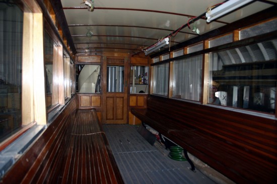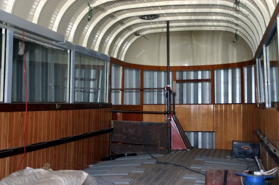 tram livery of red and white and work is currently being undertaken on the finishing touches of the livery. Internally both staircases are in place and the seating is installed on the lower deck but remains to be fitted upstairs.