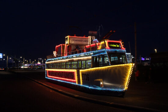 Blackpool’s Illuminated Frigate in 2006 still had its original (well, original for its rebuild anyway) light configuration with alternate colours on each bulb and was also still running without any external advertising (it had only been relaunched the previous year on a very wet evening). It also still had the fleet number 736 in large letters on the bow. This view shows the Frigate approaching Bispham on an illumination tour during the evening of 4th September 2005.