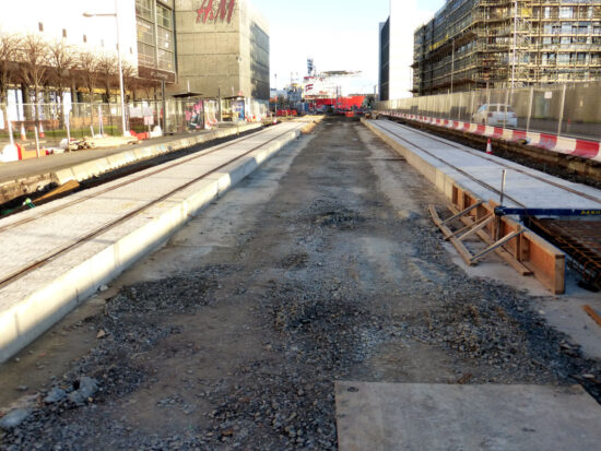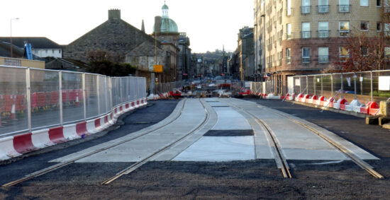 The Trams to Newhaven project in Edinburgh – due to see trams running from the end of the current line at York Place to Newhaven via Leith Walk and Ocean Terminal from 2023 – may have had a Christmas shutdown but before then a good deal of progress was made with the November and December period seeing the first track laid. In this latest pictorial update John Hampton brings us a couple of images taken in late December showing some of that track now in place.