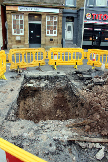With the road works on Central Drive at the junction with Chapel Street in the centre of Blackpool requiring a large hole to be dug in the road an unexpected recovery were sections of old tram rail. Here we see two bits of rail on the far side with another couple of sections having already been removed in the lower section of the picture. Trams last ran on Cenal Drive in 1936. (Photograph by Tony Armitage, 30th January 2021)
