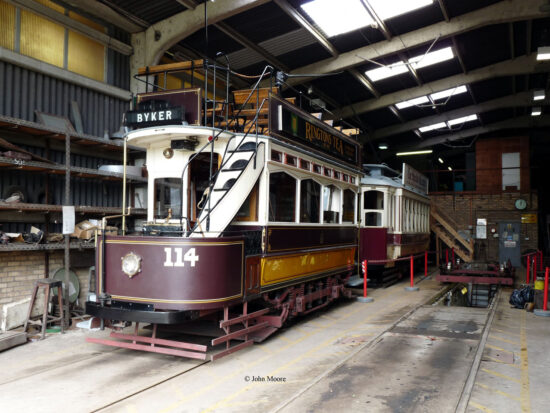 In this view – taken on 22nd June 2009 – we see 114 in the depot at Beamish. Behind is Oporto 196 when in its Beamish Tramways livery.