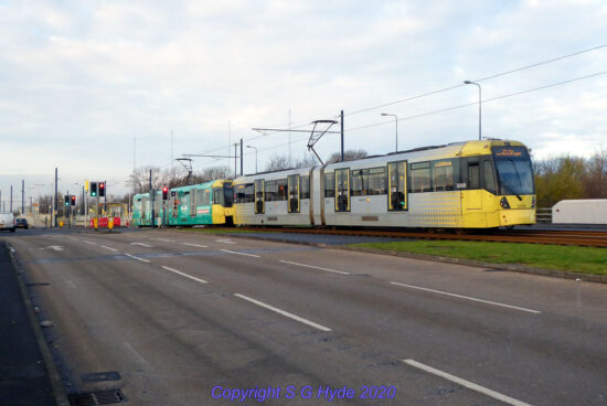 With reduced services running on most lines (although some lines have seen an improved frequency) the number of double trams in operation has increased to allow for increased social distancing. This has led to some lines which very rarely saw doubles running being more used to this and the Ashton line has not been immune to that as seen in today’s photo.