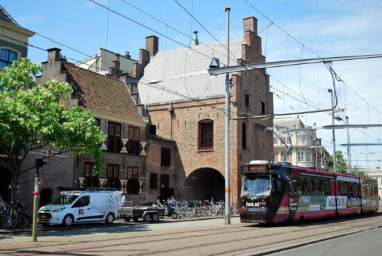 In this image, dating from 4th July 2017, the tram we see is GTL8 3139. Rather than the standard fleet livery it is in an advert for the Dutch National Theatre. The tram is just passing the Museum de Gevangenpoort and is now running along Buitenhof in the centre of Den Haag on a southbound working of Route 1. The Gevangenpoort or Prisoners’ Gate was built in 1280 as the main entrance to the Binnenhof castle which today is on the other side of the road. It gained its name in 1428 when it first also served as a prison but today is a local history museum.