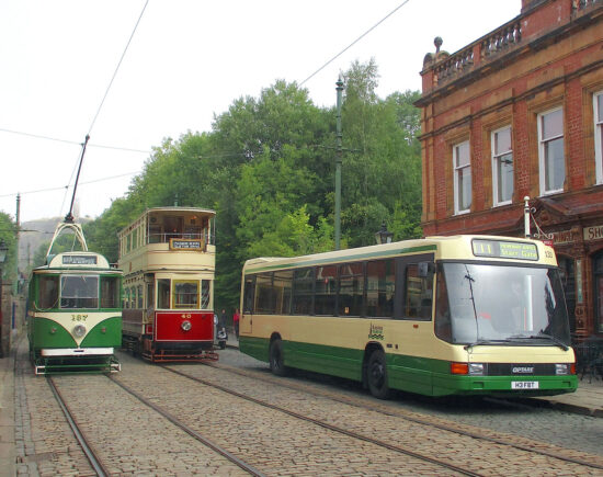 In this edition of “Trams &” we are at the Crich Tramway Village but the photo has a distinctly Blackpool feel as there are two trams and a bus which all originate from the Fylde Coast.