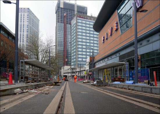 The next new tram line due to open in the UK is likely to be the second phase of the West Midlands Metro Birmingham Westside extension with service due to commence between Library and Hagley Road, Edgbaston at some point in 2021. Good progress is being made on construction works and in this article we take a look at two of the three new tramstops which now have fully glazed shelters.