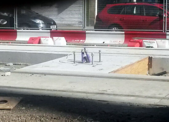 We have seen during our regular pictorial updates that track has been laid in various areas with new road surface also been installed on top of this. There has also been some progress on the construction of tram stops with work now having got underway at the Foot of the Walk to put the tram stop in here. This has involved the closure of the eastside of the footpath between the Foot of the Walk and Laurie Street.