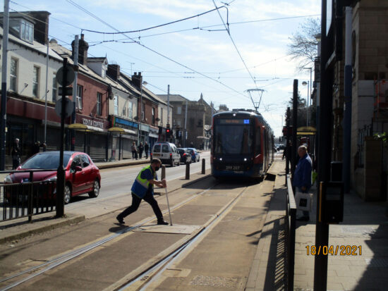 Over the past few days there has been a fault with the automatic points at Hillsborough Corner on Stagecoach Supertram where the Blue route diverges from the Yellow route as it heads down Holme Lane. This has required the manual operating of the points so that trams can still travel down to Malin Bridge as seen in the below photo from Stuart Cooke.