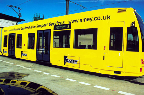 CR4000 2542 arrived in Croydon from Austria on 22nd February 1999 in the standard fleet livery (at the time) of red and white but even before the first public runs had taken place in May 2000 it lost these colours in favour of an advertising livery. The sponsor of the tram was Amey Construction who, as we have seen over the past few weeks, were involved in the consortium who constructed the system back at the turn of the century and presumably this livery was done as part of their contract. Featuring a mainly yellow base it was contravision free (probably before contravision was much of a thing on trams!) ad and would be in place between October 1999 and October 2001.