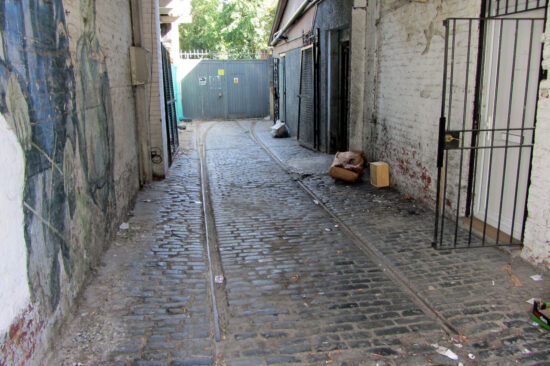 The entrance to Highgate Horse Tram Depot is near Archway on Holloway Road. The depot itself was opened by the North Metropolitan Tramways Company in 1873 before being taken over by the LCC on 1st April 1906. It only lasted a further year with it closing in 1907 as all the routes in the area were fully electrified. This piece of track is thus a remarkable survivor with it having remained in situ for well over 100 years with the entrance between two buildings which extend over the track.
