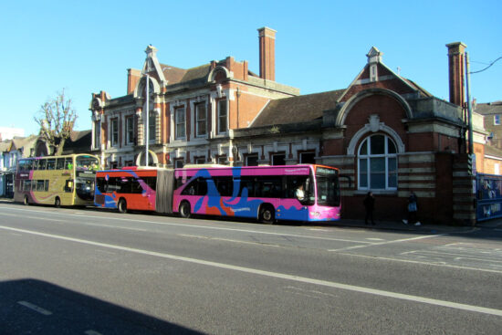 As well as the depot the adjoining former Corporation Tramway offices are still standing although they are now used by a number of small businesses. In this view two brightly coloured buses stand outside.