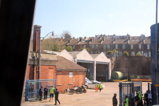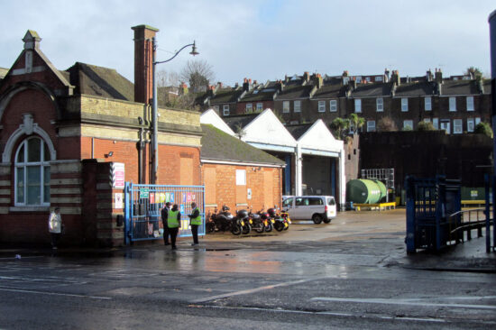 The entrance to the depot. You may just note on the left hand side a former trolleybus/tram traction pole with a street light on it.