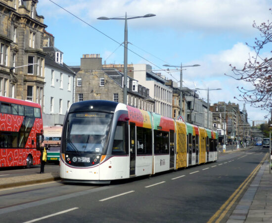 This photo shows 276 heading for the Airport having just crossed the junction with Frederick Street. Two significant things to mention on the left – one is Lothian Buses 551 with a special livery for Poppy Scotland and the other is the woman taking a photo. Could she be bemoaning the arrival of the tram blocking her view as she was taking a picture of the Old Town? She’s obviously determined to get her shot though as she is standing in the middle of the road as opposed to the central reservation! (Photograph by Roy Calderwood, 5th April 2021)