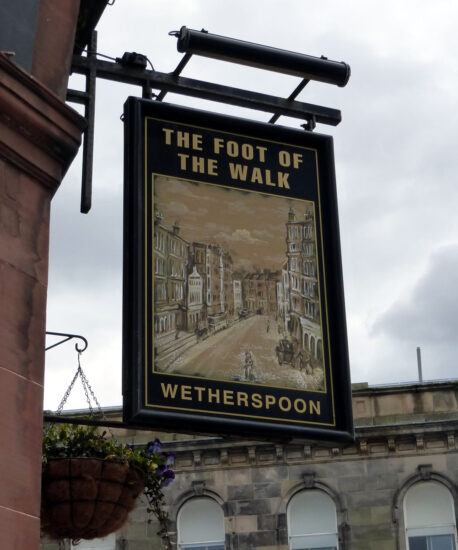We return to take another look at a “Tram Pub Sign” with a trip into Edinburgh and a pub which, unlike all those we have seen in the series so far, will in the near future actually see trams running past again. The pub is owned by Wetherspoons and is the Foot of the Walk in Edinburgh.