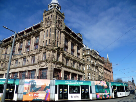 This image is taken just on the corner of Princes Street and South Saint Andrew Street where the tramway curves round on its way from the stop at St Andrew Square onto Princes Street as it continues on its way to the Airport. The building in the background here was built in 1906/7 as the R W Forsyth department store which closed in 1981. It was bought by the Burton group (later Arcadia) and in recent years the upper floors were converted to a Travelodge. The Topshop/Topman store on the lower floors has now closed following Arcadia’s demise and this now waits a new use.