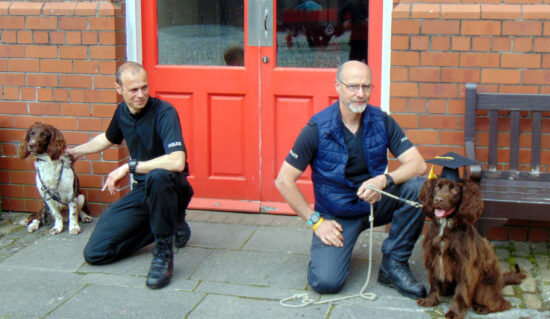 Two recent Police Dog graduates have been Indy (a 2 year old brown and white Springer Spaniel) and Ziggy (a 2 and a half year old brown Sprocker Spaniel) and they passed with flying colours after undertaking a six week search course. The dogs live with their handlers and will often service for 8-10 years in the police force, depending on the breed and agility of the dog. Derbyshire Police also use German, Dutch and Belgian Shepherds for other police activity.