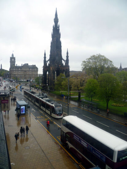 At British Trams Online we always like to see whether there are any different angles for a photo and so when we received the below photo we were delighted to include it (even if it doesn’t show Edinburgh in the best light on a grey and wet early May day!). Taken from the Menswear department of Marks & Spencer on Princes Street (located on the second floor of the store) we can see plenty of architectural interest in the shot as well including the Scott Monument in the centre (200 feet high and located in East Princes Street Gardens), Balmoral Hotel and clocktower (only 190 feet high!) on the corner of Princes Street and North Bridge), the Nelson Monument on the extreme left and the spire of former Tron Kirk on the far right.