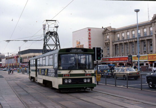 In this view we see 645 heading past Central Pier with a timetabled service to Starr Gate on 30th April 1989. Still in fleet livery it has adverts on the side for Cats at the Opera House which was the big show of the season there running between May and November.