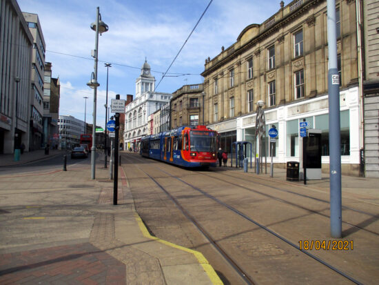 When the Supertram system first started to run on 21st March 1994 it was only a fraction of the network we know today with trams running from Meadowhall just into the city centre at Fitzalan Square. It wasn’t to be until 18th February 1995 that trams would get further into the city centre when they continued along High Street to Cathedral. Its on this latter section of track that we see in the below photo with the one-way High Street for traffic seen on the left and the segregated double track tramway on the right.