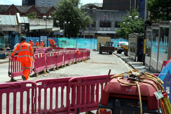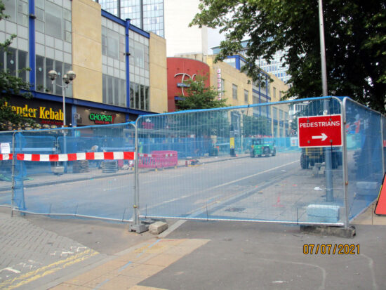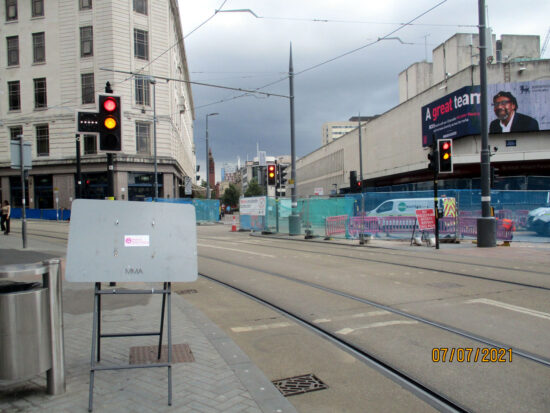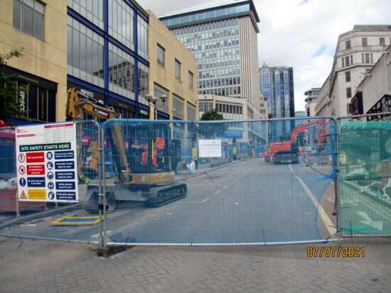 We start on the Eastside extension with this view taken just where Corporation Street and Bull Street meet. This will be the main focus of works from the end of July when the current tracks are connected to those on the Birmingham Eastside extension. Preparatory works are already underway behind the green netting – note the Midland Metro Alliance pink barriers – and this will continue to allow tracks to be installed between the end of July and October.
