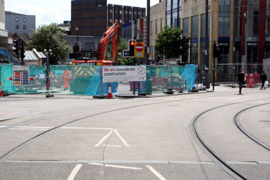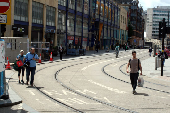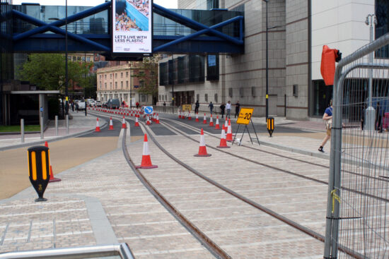 Looking down Corporation Street with the junction of the Eastside and City Centre lines just seen on the left. Corporation Street will also be the subject of rail replacement works during the closure.