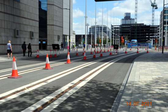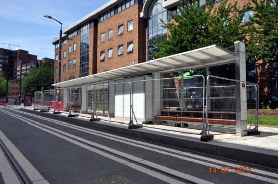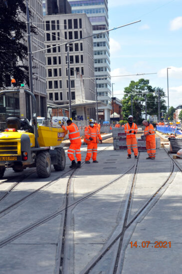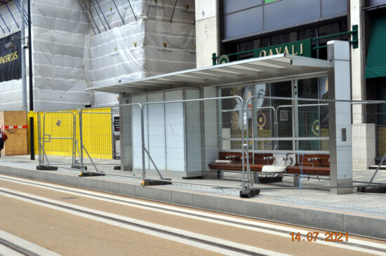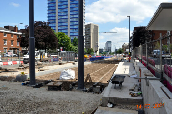 Phase Two of the Birmingham Westside extension from Library to Hagley Road, Edgbaston is likely to be the next tramway extension to open in the UK with it currently planned to be welcoming its first passengers in December 2021. Work on the line has been progressing well throughout the pandemic with all track now down and work concentrating on other infrastructure and public realm improvements. Ken Jones took a walk along the line in mid-July to see recent progress.