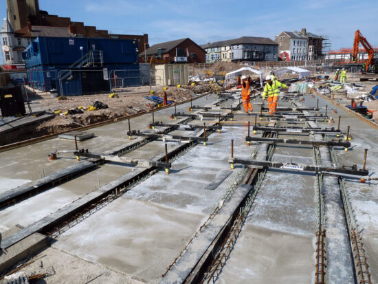 Whilst sometimes with our regular updates from the Blackpool Tramway extension it can be a case of “what has actually changed” this latest article is very different as we can see good progress at both ends of the line. At the Talbot Square end there have been additions to the wiring with the first frogs installed while up at Wilko’s after several days of preparation the concrete has been poured around the rails.