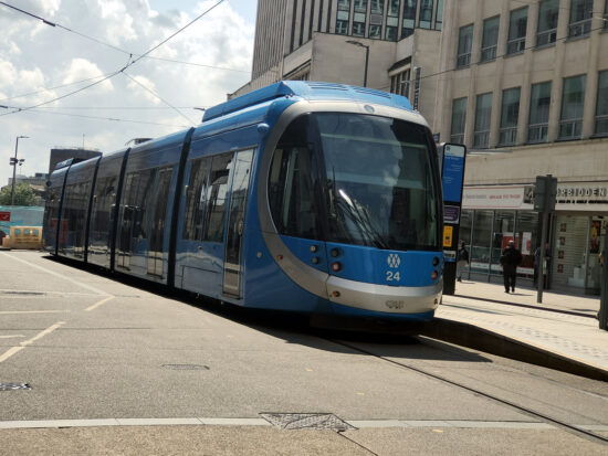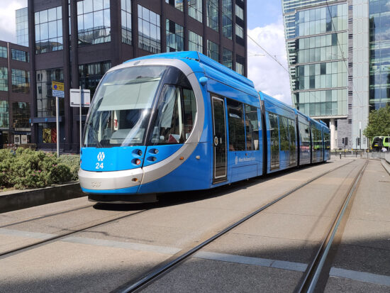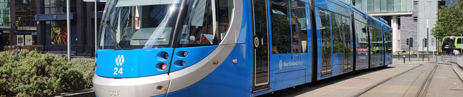 The only tram on the West Midlands Metro network to have carried two external commercial advertising contracts since the larger adverts were carried is now back in fleet livery after the ending of its latest deal. 24 is now running in the full West Midlands Metro blue livery after its adverts for Resorts World were removed.