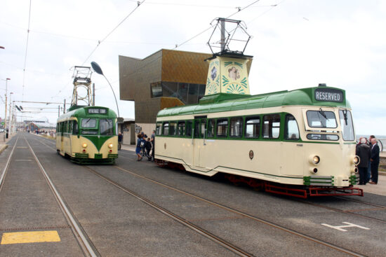 As 631 waits at North Pier heritage stop for departure on its launch – invited guests only – trip Flexity2 011 is seen alongside.