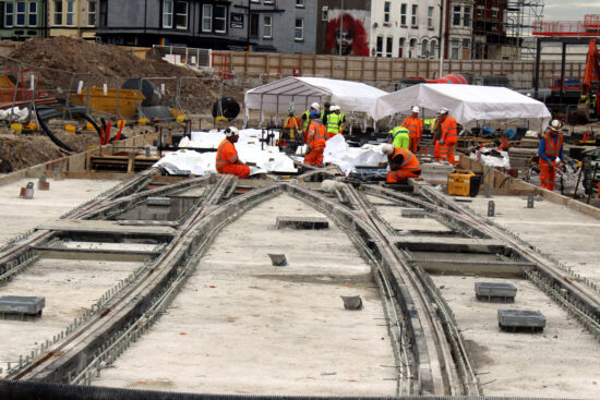 Since the overhead installation for the Blackpool Tramway extension began last month it has been taking place on the section where the new line connects with the old Prom line. This has seen overhead put in place on the south and north curves along with various span wires and frogs in preparation for trams both pantograph and trolley fitted. But now work is moving along Talbot Road with the first span wires now in place up to the new Premier Inn (on the site of the old Yates’ Wine Lodge). We take a look at those new wires – as well as a quick look at Wilko’s – in this latest pictorial update.