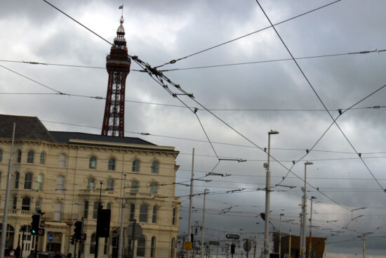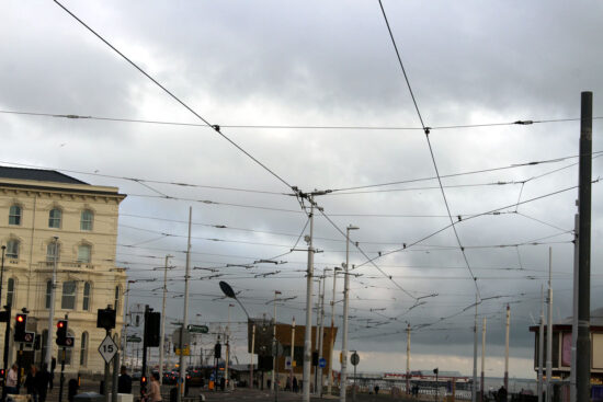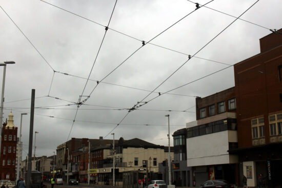 This spider’s web of wiring is seen at Talbot Square where the current Prom line meets the new extension. We are looking south towards the southbound North Pier stop with the south curve seen disappearing to the left hand side.