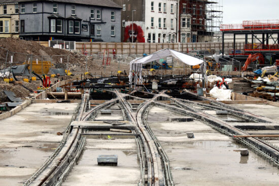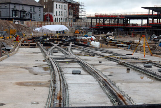 We again head to the Fylde Coast in this article as we take a look at recent progress on the construction of the Blackpool Tramway extension along Talbot Road to Blackpool North Railway Station. As we’ve come to expect there are two areas of work – down at Talbot Square where overhead wiring is being installed and up at the former Wilko’s site where there is tracklaying for the final section of tramway towards the terminus.