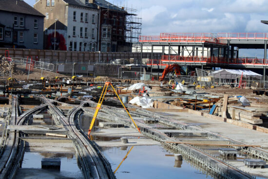 In this latest update from Blackpool where work to complete the extension of the tramway along Talbot Road is continuing we again take a look at the progress being made on the wiring in Talbot Square and on the junction with the current Promenade line as well as viewing the work happening on the old Wilko’s site which will contain the new terminus. Tony Armitage paid a visit on 19th August to see what progress has been made.