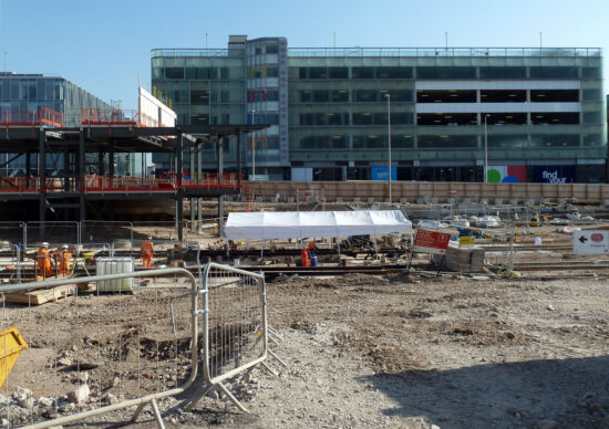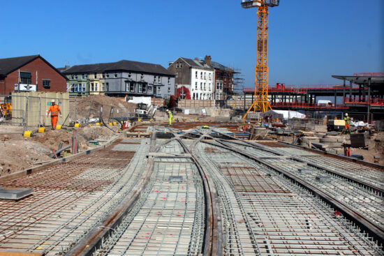 The terminus of the extension up Talbot Road will be located within the site where the Wilko’s store once stood and the past few months have seen site preparation works followed by initial track laying and concrete pouring. Included in the track laying has been installation of a scissors crossover. The tracks enter the site roughly where the entrance to Wilko’s was and then after the crossover curve round to where the actual terminus will be. In previous updates from Wilko’s we saw that although there was track at the terminus there was a small section which had yet to be completed as it was being used for works access but recently this has also been filled in so that track does now run all the way through.