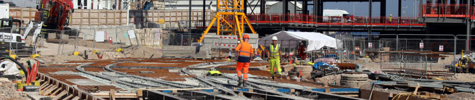 With the hotel and restaurant building in the background continuing to go up the left hand side here shows where the tram terminus will be with space in between the tracks for an island platform – the first one on the modernised Blackpool Tramway! (Photographs x2 by Peter Dockerty, 7th September 2021)
