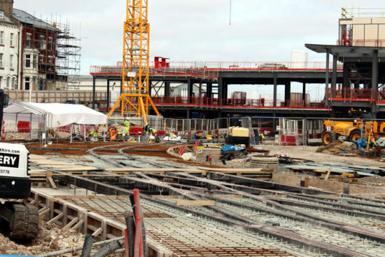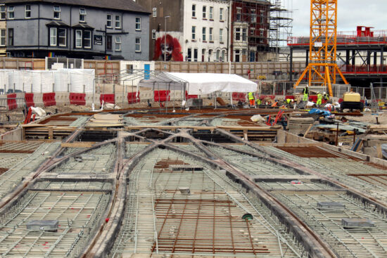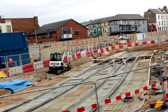 It may have been a few weeks since we had our last update from tram construction works at the former Wilko’s store site in Blackpool but that’s mainly because progress has somewhat slowed in laying the tracks and fixing them into position. When we last reported from the site we mentioned that all track was now down – including the final section just before the actual terminus – and that is still the position we are in with further concrete still be poured to complete the track laying side of the project.