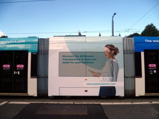 262’s advert follows the usual advert pattern of full height vinyls on the third and fifth sections of the tram with the remaining sections just having ads above the windows. Using various shades of blue, one of the full height sections just has the simple Clearwater Analytics logo with the other featuring a woman and the wording “Discover the difference transparency in data can make for your business”.